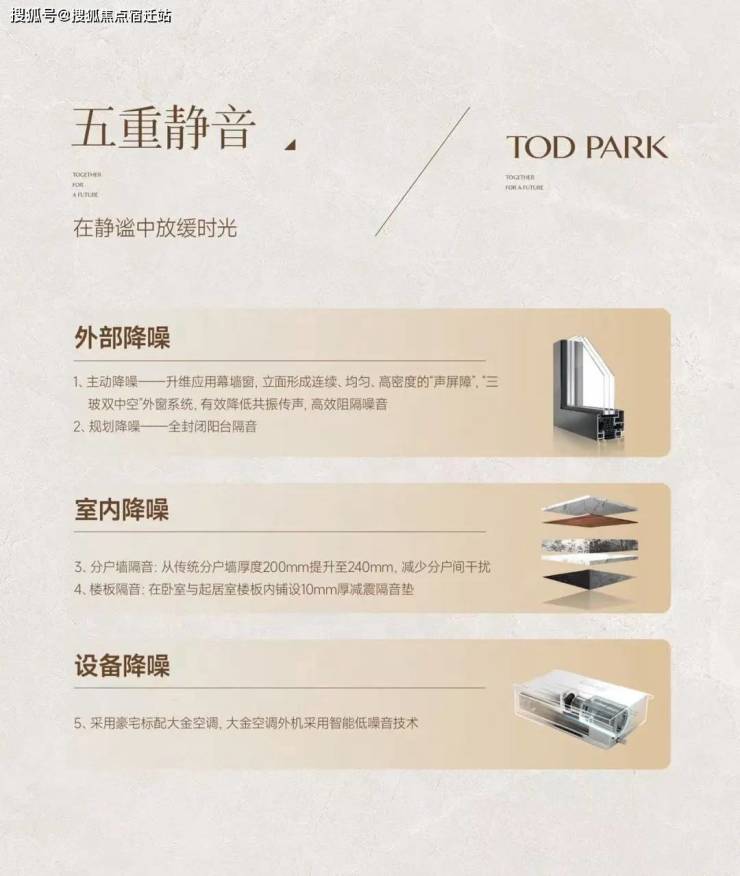 ▶五重静音,三玻二腔外窗系统、设备主机房设置架空车库层及以下、分户墙提升至240mm、铺设10mm减震隔音带、大金空调