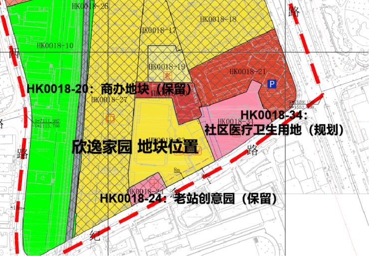 项目位于纪念路北侧,东临逸仙高架路,左下角是一个已建的3层中宏公寓,东侧紧邻HK0018-34地块,规划为社区医疗卫生用地;西侧是高层小区欣逸家园。