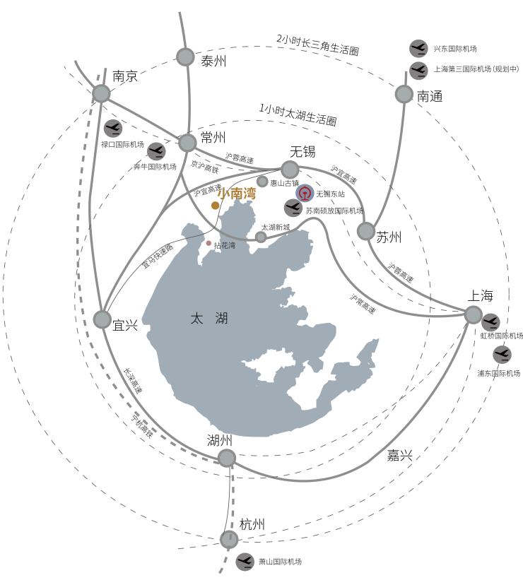 【区位信息】所属板块:小南湾位于无锡太湖国家旅游度假区,阖闾王城之下太湖秘境,茶园幽谷,吴地原乡,千亩良田,得益于吴国长城及龙山延绵,风水福址。