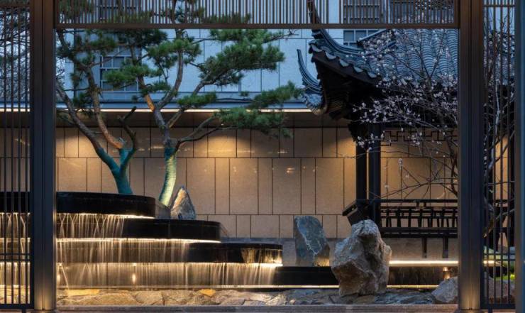 天朗气清时,水墨色与美国白金石的金绿辉映,交织出一种奢华但又深邃的沉静感。保证绝对的隐私性和生活品味。台阶、格栏、水系、亭台、树柏,层层递进,涵雲軒在追求美学的同时,做出了真正意义上的“隐奢”入口。外界无法一眼窥尽全貌,更添高门大户之神秘感。
