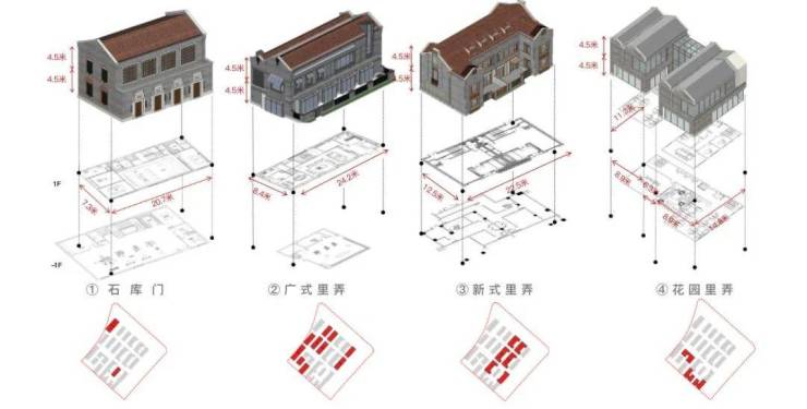 形态分布:广式里弄、花园里弄、新式里弄、石库门风格四种