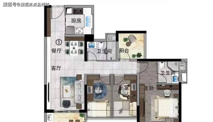 建面约100㎡单位,能做到四开间朝南,让阳光的足迹,透向餐客厅、阳台、主卧、双次卧,全屋通透明亮。