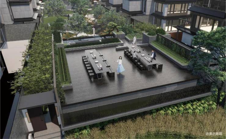 利用高差设置观景平台,为业主提供停留、休憩、赏景的场域,近可俯瞰园区内曼妙风景,稍远处可眺望运河风光。也可在此品茶、听音乐,如同再现宋徽宗赵佶《画唐十八学士图》的优雅场景。