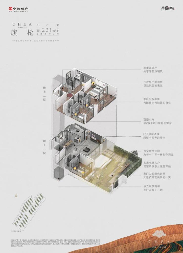 以建面约210㎡的上叠“云雾”和建面约221㎡的下叠“旗枪”为例。月陇云岚解决了很多叠院上下叠共用电梯这个痛点,在这个项目里,所有的户型都是私梯入户的。下叠入户口在南向花园,上叠在一楼也有北向私梯入户花园空间。
