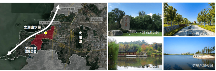 【生态宜居绿肺 护航健康人居】区域内大阳山、太湖国家湿地公园、太湖山水带环绕,12座山体、34条河道湖泊交织,生态环境优越;已新增和改造绿化约500万平方米,打造彩石湖公园、恩古山公园、小茅山公园、诺贝尔湖公园等公园点缀。