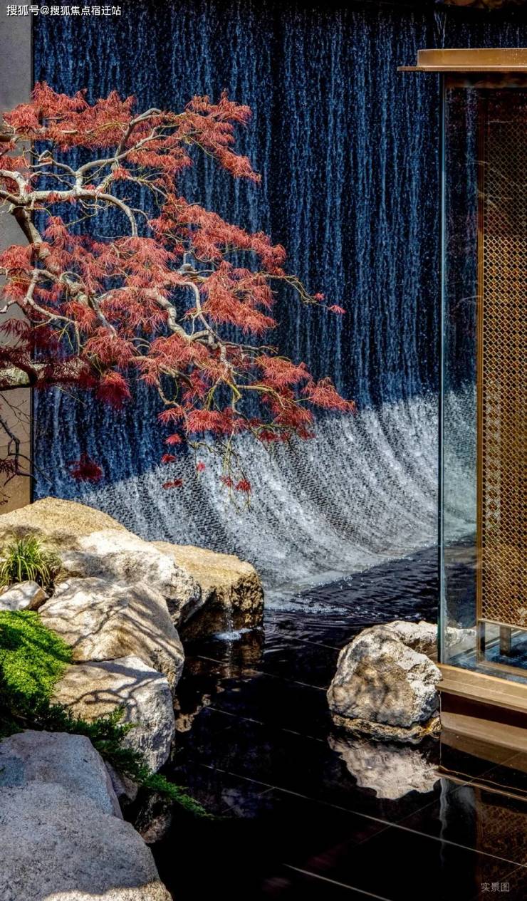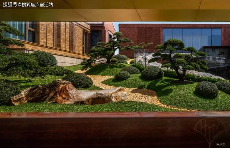 山水庭院汲取《足立美术馆》的造境手法,以老石皮、百年古木原样搬运,重现山间岁月的自然痕迹,与庭院中的光影交织,仿佛将山间的自然采光与静谧之感搬入城市。阳光透过树梢洒落,石皮上的纹理在光影中若隐若现,宛如一幅流动的自然山水画卷。