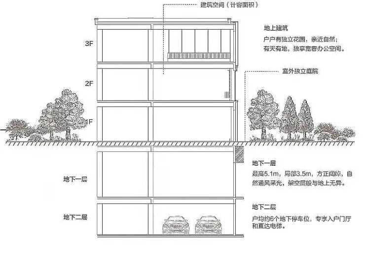 西溪印附送超大地下使用空间,地下一层约5.1米层高(局部3.5米),超高使用率,满足个性化定制需求,赋予企业活动场地、私享会所的可能。