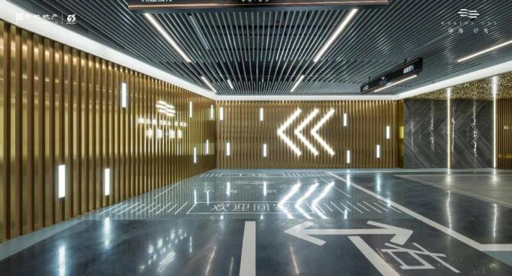车道上方区域,采用格栅吊顶设计,优化了管线排布,提升颜值;人性化地下指示,一日了然,方便行车。