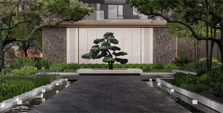 “做豪宅一样做大门”,48m豪气门楼界面,5.7m顶奢高度,贝金米黄大理石+潘多拉奢石门前衔接125m宽3800㎡鲜氧草坪。“给大树造底座”。给重要的大树打造了台子,米白色玉石透光石+爱马仕灰大理石+贝金米黄大理石,独特造型树,寓意归家美满。