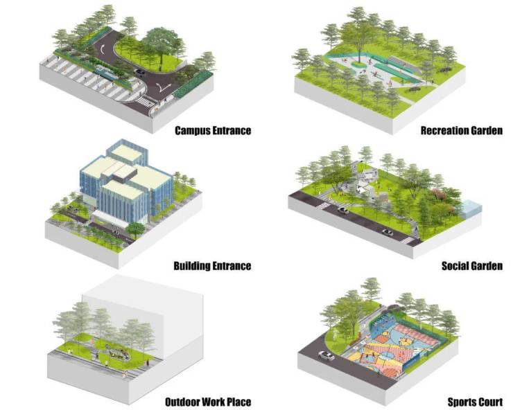 项目共有五个地块,各个地块空间尺度与建筑布局不尽相同,设计希望通过将景观模块化,根据不同侧重与需求,将模块景观直接置入场地,实现五个地块的统一,同时通过对基础模块的演变,形成五个地块的特色。
