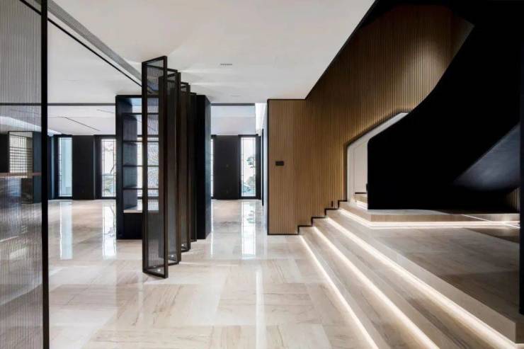 社交客厅对面的茶室呈对称式布局,简素的木质家具掩藏在朦胧的屏风后。进退之间是人与景相逢将东方精神融入现代生活入户景观延续了山水园林的意趣,修竹如玉,流水汀步。随下沉庭院缓步慢移,即达地下二层的主客厅。