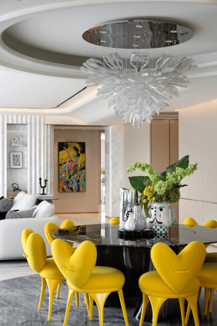 比较开放空间的不同因地制宜,在原始建筑平面基础上,我们采用「化整为零」的空间处理法,将阳台纳入室内,扩大原有公区面积,释放空间边界,打破动线区隔,形成一体化的“双客厅”概念。客厅、餐厅、LOUNGE、中西厨、艺术品整体呈开放式布局,公区空间大气灵动。