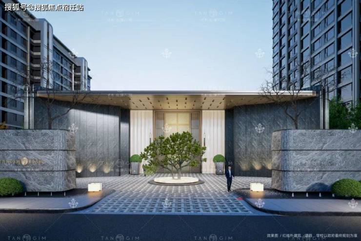 项目在社区外约50米处精心打造了迎君礼道,前方景墙运用奢华的海浪灰烧洗面花岗岩定制而成。