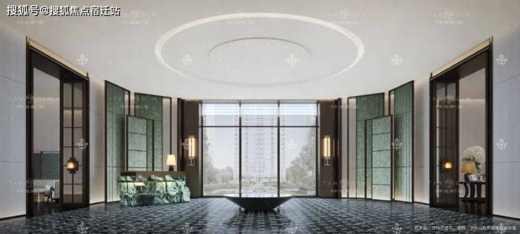 大堂地面采用交龙纹石材铺装,接待台以天珺专属的马尔斯绿奢石精心打造,墙面装饰artdeco风格中古灯具。