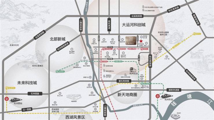 高架:向东约1.5km秋石高架,往北约2km运溪高架,向西连通上塘高架,实现南连武林,西抵云城、未来科技城,形成半小时杭州生活圈