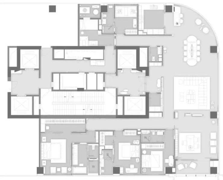 户型由GFD广飞设计事务所创始人叶飞亲力打造。五间豪华套房与三大公共空间的布局,能够满足每一位家庭成员的个性化需求。双重入户动线与私属门厅玄关,尽显归家的尊崇礼序。