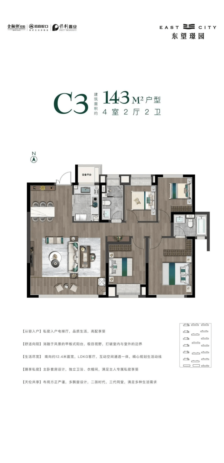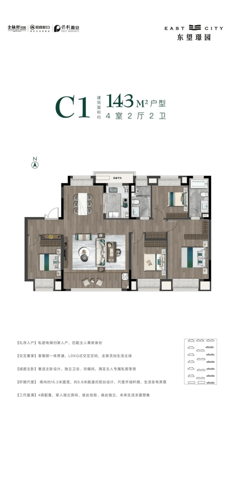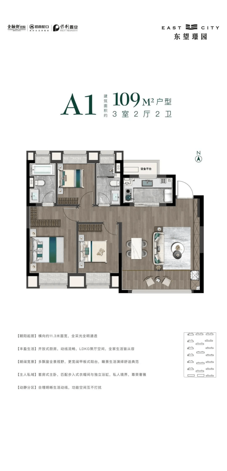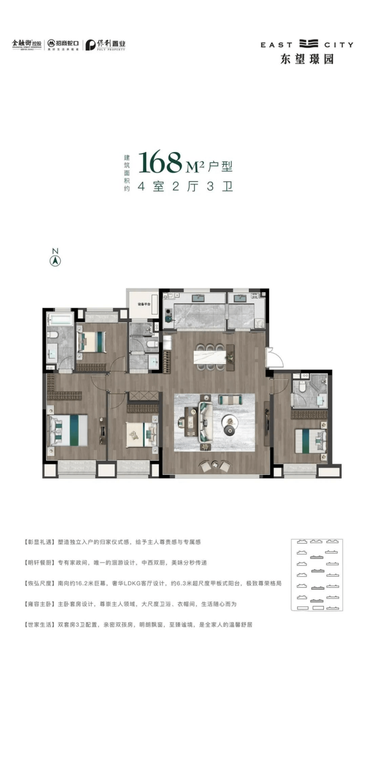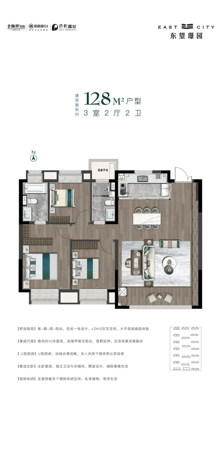 无界的宽奢居所为了柔化家人之间的无形边界,东望璟园,建面约110-168㎡无界宽奢居所,LDKG超大交互空间,南向超大面宽,甲板式阳台,不断延伸居住边界,为高端改善家庭铺陈无限生活可能。