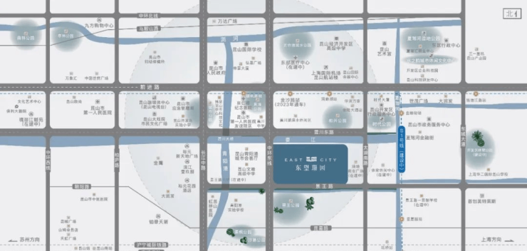 左拥金鹰购物中心、九方购物中心、大润发、万达广场 右揽世茂广场、首创奥特莱斯[ 双面菁英优教]:上海华二昆山国际学校、景王路一贯制学校(在建)、昆山国际学校、青阳港实验学校、震川中学[双享宜居胜地]:
