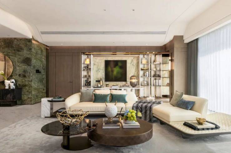 在独处、家庭和社交场景间自如切换,现代的游园之境,亦是心中的静谧之地,背景墙以绒面材质、叶面的曲线分割结合金属,形成质感丰富而柔和温润的空间氛围,憩于自然生活美学,获得精神的愉悦放松。华丽、艺术、时尚元素,赋予奢华空间新内涵。