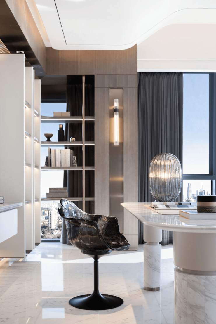 闲章」则拥有独特的动线和布局,打破「入户即厅」的传统思路,开门第一眼看到的是茶室,亦可设计成书房,营造极富隐奢之感的自我场域。双面转角窗设计演绎极佳的城市视野,先锋河、钱塘江一览无余,在都市繁华之中,勾勒一方心灵的宁静之地。