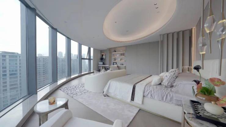 约450㎡“香奈儿”西边套,将原本多见于餐桌和墙面的白金沙奢石,漫铺于双厅地面之上。浅淡得宜的洁白,温润如玉的蜜色,将空间衬得时髦优雅。能眺望钱江两岸的梦幻天际线,“宇宙中心”奥体尽收眼底,也能俯瞰城市霓虹,车水马龙就在脚下。整个中心的璀璨世界定格在落地窗前,像一张巨幅明信片。