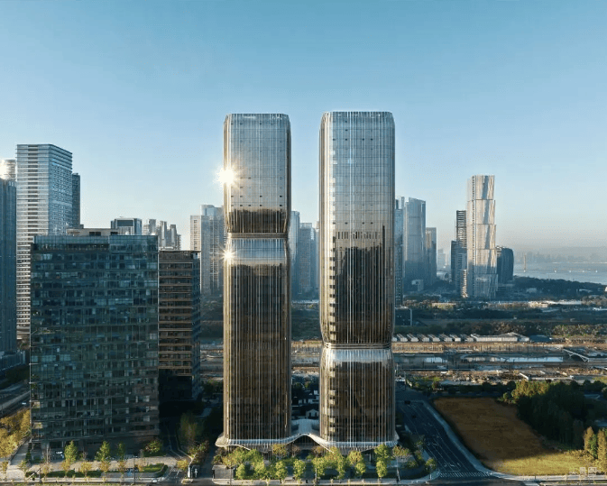 整体设计以“藕节双塔”为灵感,荣获CTBUH2024全球高层建筑奖,外立面采用玻璃幕墙与金属格栅组合,兼顾现代感和私密性。