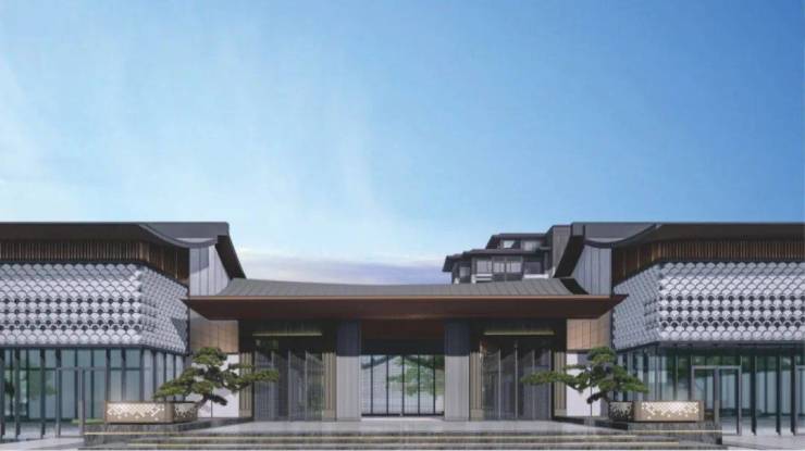 大门的装饰也别出心裁,入口两侧种植了迎客树,往里走便是迎宾水景,有潺潺流水的点缀,多了一丝灵动。而金色格栅的设计,既大气风雅,又不失时尚感。
