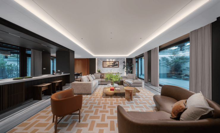 来到地下一层社交客厅,设计师通过水墨的意境连接园景与室内,流水波纹似的整铺地毯将素简庄重的灰色主沙发和单人椅衬托为坚实的磐石,浅色的木质茶几则平衡了过于沉稳的色调。