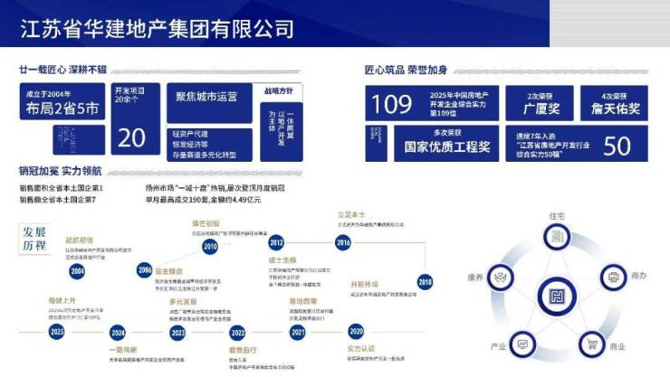 华建地产成立于2004年,专注房产开发21年。自成立以来始终秉持“精工品质,精致服务”的管理理念,构建起住宅、商业、商办、产业等综合发展的横向生态链。截至目前,华建地产在扬州、盐城、徐州、广安、成都两省五市独资、控股、参股开发了20+口碑项目,开发面积逾500万㎡。
