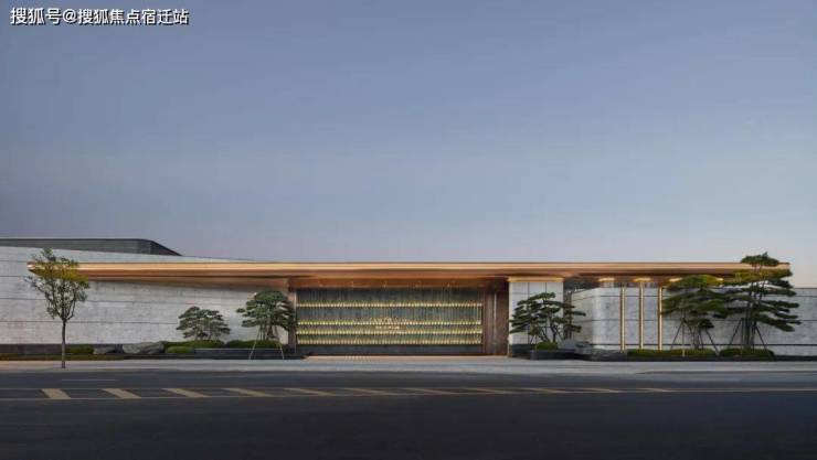 临路设置侧入式的门楼作为人行主入口,采用非对称布局,拉长前场景观动线,营造游园入境、自然隐奢的归家体验;入口门楼高宽比例控制在1:10,强化横向超尺度比例。