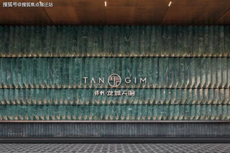 门庭正中为墨尔本绿奢石照壁,此款奢石得名自澳洲,经多轮实地比选后定样。约700块精选的墨尔本绿石材构成了这道宽约18米,高约5.4米的奢石景墙,经过切角与镶嵌的装饰主义划分,在不同角度呈现出波纹流转的变化。