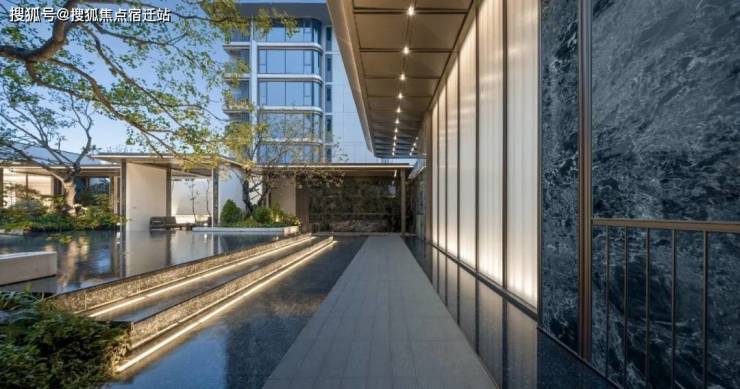 耗资千万的超星级酒店的主入口,超40米宽,恢弘大气;门楼飞檐采用金顶折板结合灯光嵌入,形成“龙鳞”般熠熠生辉的入口仪式;两侧更是使用大面积Prada绿奢石作为大门主基调,实打实的天然石材,辅以金属线条包边,打造步步尊崇的归家门面。