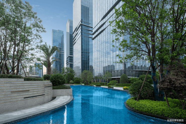在这寸土寸金之地,钱潮鸣翠还做出了近6000㎡围合式园区,构筑了一个由加纳利海枣树阵、露天海洋之星水池、下沉式恒温泳池会所组成的侈丽世界。