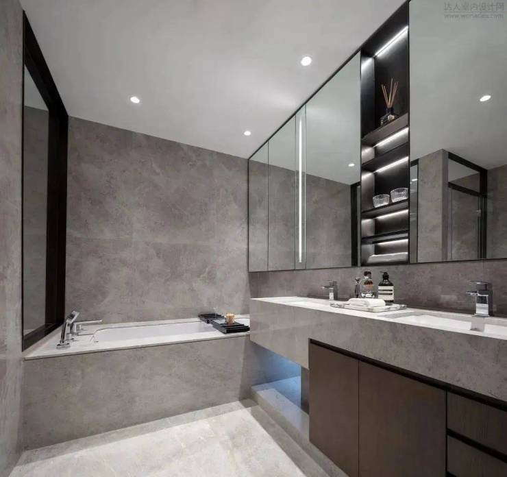 带独立浴缸的主卫,充满酒店格局,是豪宅应有的样子。卫浴空间极致的简约风搭配大理石质感的墙面和台盆,尽显优雅精致。干湿分离,墙柜、洗漱柜等满足日常收纳,使居者的身心得到惬意的款待。