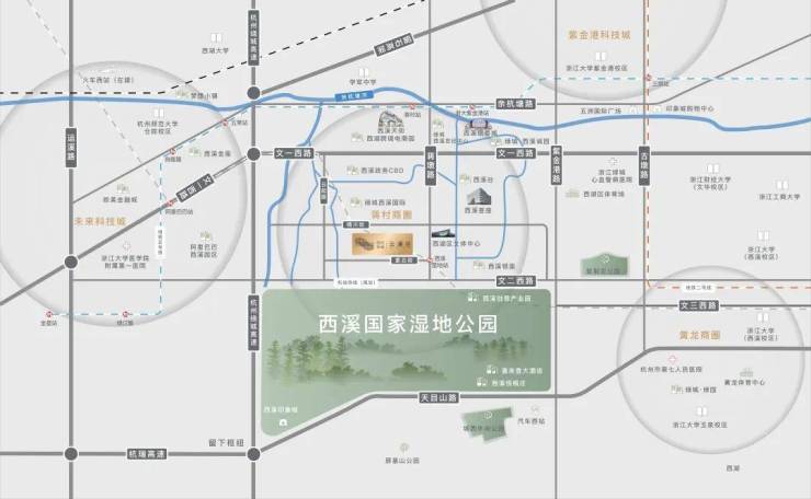 【城市干道】:横向上,余杭塘路,文一西路,文二西路由东向西串联起了杭州老城区和未来科技城。纵向上,绕城高速、紫金港路、古墩路由北至南串联起了浙江大学以及西溪湿地。