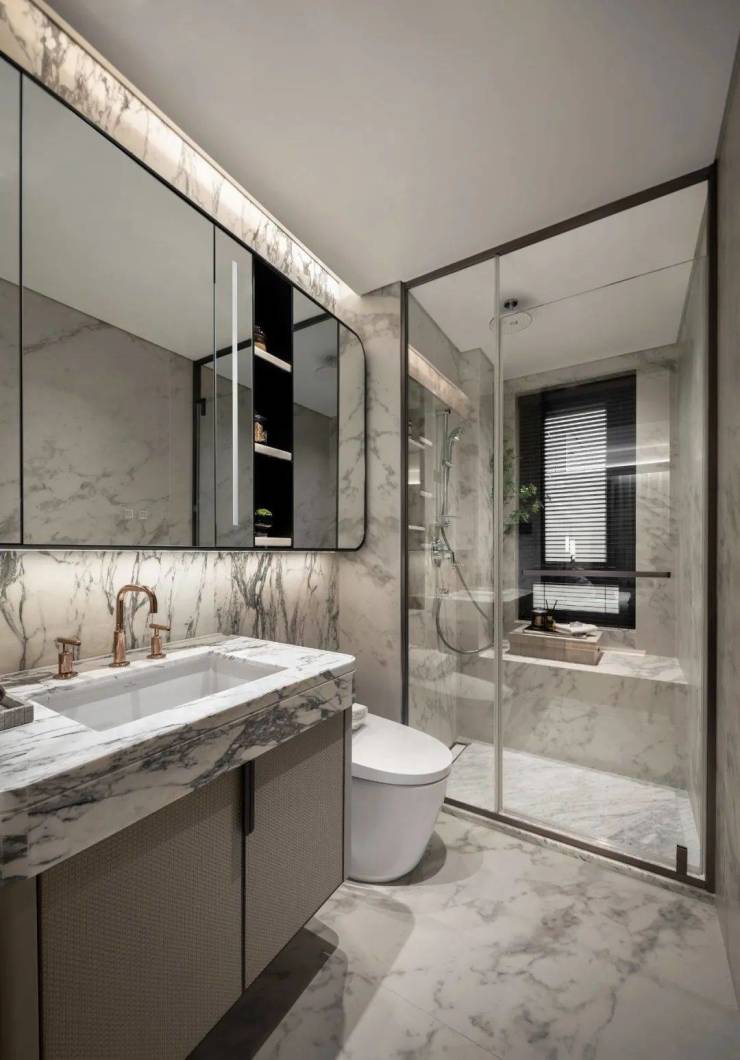 追光式奢石品质地库。车库入口,以颇具艺术感空间的坡道尺度,配合天然玻利维亚蓝奢石墙面,追光式的灯带设计,营造层层递进的礼序感;车道归家路,奢选金属格栅,通过阵列排布结合防眩光灯光,进一步烘托庄重典雅的鎏金空间氛围;通过轻盈质感的玻璃大门进入内部,优雅抵达。