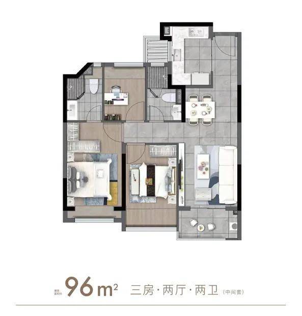 「建面约96㎡3房2厅2卫」