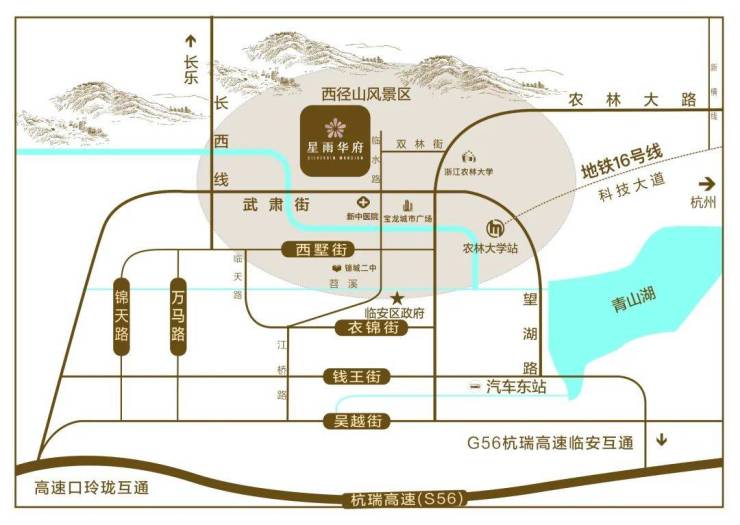 临安雨润·星雨华府, 位于杭州市临安区锦北板块,背依西径山脉,得天独厚自然景观资源,直线距离农林大学东湖校区约400米、宝龙商业广场约900米,3公里内地铁16号线农林大学站、锦城二中、新中医院等医、食、住、行、学配套醇熟,繁华与自然兼得。