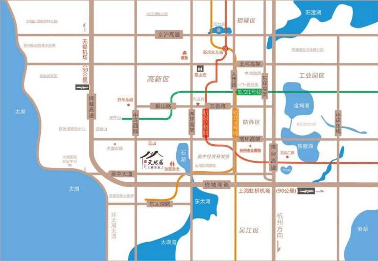 自驾:吴中大道三分钟上中环西线,苏福快速路,南环高架直达市区,苏州三大高铁站极为便利;8分钟从吴中大道进入沪常高速—苏绍高速—无锡支线共计50分钟到无锡硕放机场;