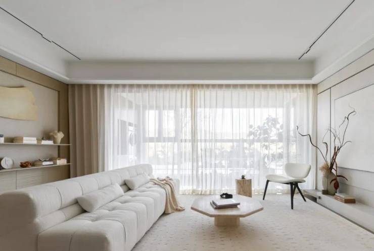 单元入户大堂,也像一个透明的玻璃盒子,顶部铝板造型,无主灯设计,用270°落地玻璃,将自然引入室内,酒店式归家美学体验。
