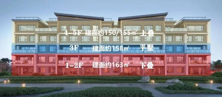❖第二种5F墅:1-2F是下叠,3F是平墅,4-5F是上叠,一线临湖,前无遮挡,视野十分开阔,南地块也仅有一栋。