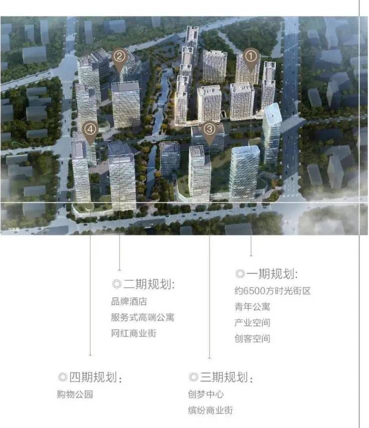 2期规划方向为品牌酒店、商业中心、服务式高端公寓、网红商业街,3期地块规划为创梦中心和缤纷商业街,4期规划为购物公园。是一个集体验式商业、跨界、创客、创业、居住、休闲6大功能为一体的约80万方全能城邦。