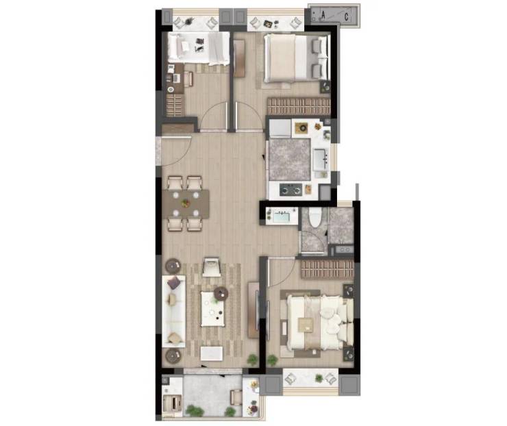 C户型 建面约88㎡ 三室两厅一卫