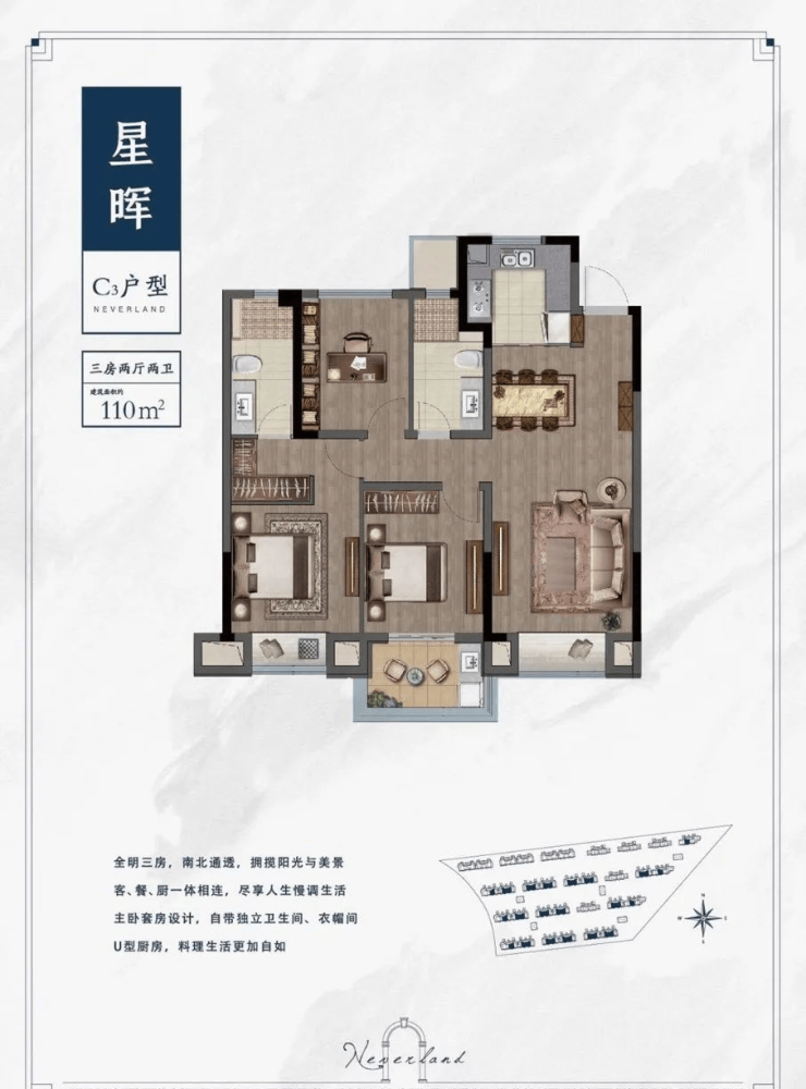 110㎡的三房两厅,相比上两个户型来的更为方正,三开间朝南,套房主卧带衣帽架,次卧难得拥有大阳台,采光效果可谓一流!全明三房+南北通透,客厅与餐厅一体,整体视觉上得到了扩展延伸!