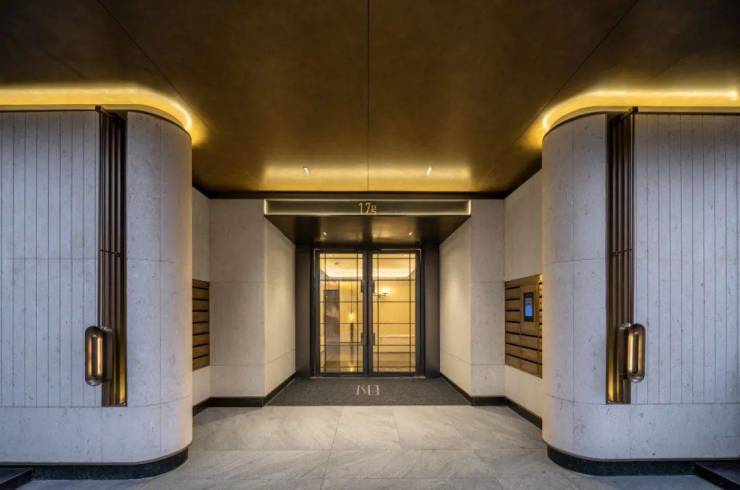 入户大堂内严选太古黑石材及绿野仙踪石材拼嵌,通过水刀石材拼花工艺,营造出从都市精致到松弛度假的情绪过渡。单元入户门头的鎏金门厅设计,手工艺术灯具、海派全自动单元门、人脸识别系统等细节运用,成为新精致青年鲜明的品味标签,引领奢雅新派的都会生活方式。