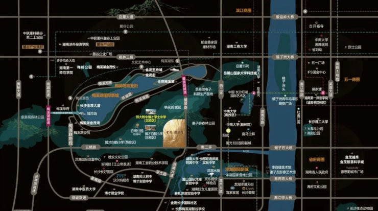 左右拥览梅溪湖国际新城、洋湖生态新城,近邻岳麓山大学科技城,尽享长沙三大热门板块红利,集聚商业、产业、生态、教育、医疗等高阶资源。