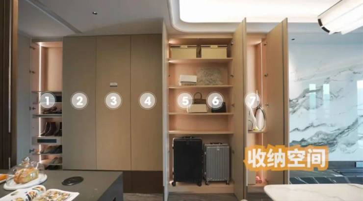 除了玄关柜外,开发商还配备了整整一面墙7个立柜!这些全是交付标准,每个空间都针对鞋子、包包、行李箱等业主需求进行个性化设计,诚意满满: