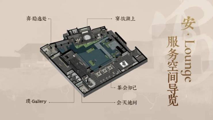 实景兑现的安.Lounge会馆,剪裁鲁迅祖宅及沈园空间格局,打造中庭镂空屋面,传承台门院落“泗水归堂”情境,五开间官宅形制,承袭超5种中国传统手工艺,点缀明代古玩物件,以文化传承为基底,创造「宴·饮湖上」、「会·天地间」、「茶·会知己」、「璞·Gallery」、「弈·隐逸处」等多元服务的雅艺空间,量身定制高阶圈层社交场域。