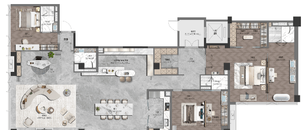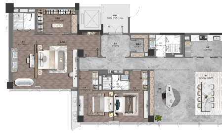 346㎡(4室2厅4卫):南朝向,双主卧套房设计,配备独立衣帽间和卫生间,私密性极佳。