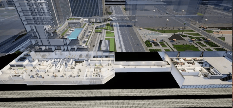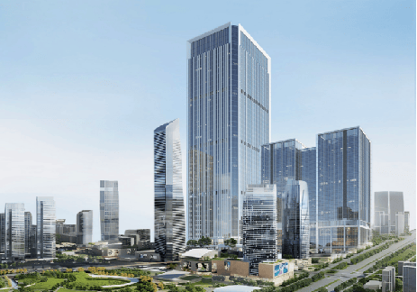 空中连廊: 约500米的空中连廊,接驳双塔的空中会客厅,链接国际商务区地上/地下空间,实现空间更大联动性